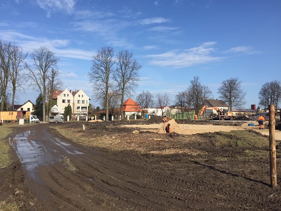 Firma Ogrody s.c ze Słupska, podwykonawca firmy Krężel (główny wykonawca) przystąpiła do przygotowania terenu pod trawę z rolki.