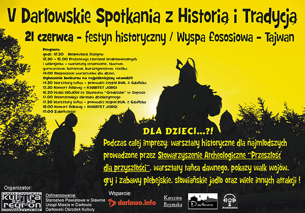 Zapraszamy darłowian i turystów do udziału w plenerowej imprezie pod nazwą „V Darłowskie Spotkania z Historią i Tradycją. Festyn historyczny, odbędzie się niczym w słowiańskim grodzisku na wyspie Łososiowej pomiędzy dwoma ramionami rzeki Wieprzy. Głównym jego motywem będzie kultura i rzemiosło dawnych Słowian. Przybyła publiczność będzie mogła odwiedzić coś w rodzaju „wioski słowiańskiej", w której prezentowane będą codzienne zajęcia dawnych Słowian, pokazy dawnego rzemiosła artystycznego oraz degustacje dawnych potraw. Muzykę i taniec dawnych Słowian zaprezentują zespoły: „DUIL" z Gdańskiej Szkoły Fechtunku oraz „Kwartet Jorgi".