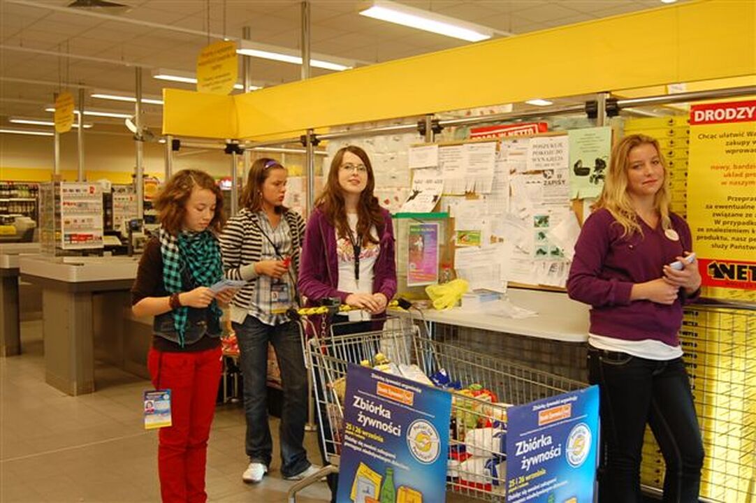 Młodzież ze Szkolnych Klubów Wolontariusza działających w Zespole Szkół im. S. Żeromskiego w Darłowie (koordynatorzy akcji: Joanna Witkowska, Waldemar Tałanda), Gimnazjum Miejskiego (koordynator akcji: siostra Urszula) oraz Szkoły Podstawowej nr 3 (koordynator akcji: Małgorzata Marek) w dniach 25-26 września uczestniczyli w ogólnopolskiej zbiórce żywności „Podziel się posiłkiem". Młodych wolontariuszy z identyfikatorami można było zobaczyć w: Netto, Lidlu, Bato i obu Biedronkach, w których witali kupujących i wręczali ulotki. W akcji wzięło udział 56 wolontariuszy i pracowników Miejskiego Ośrodka Pomocy Społecznej. Wspomagali zbiórkę produktów spożywczych: Bank Żywności i Fundacja Polsat.