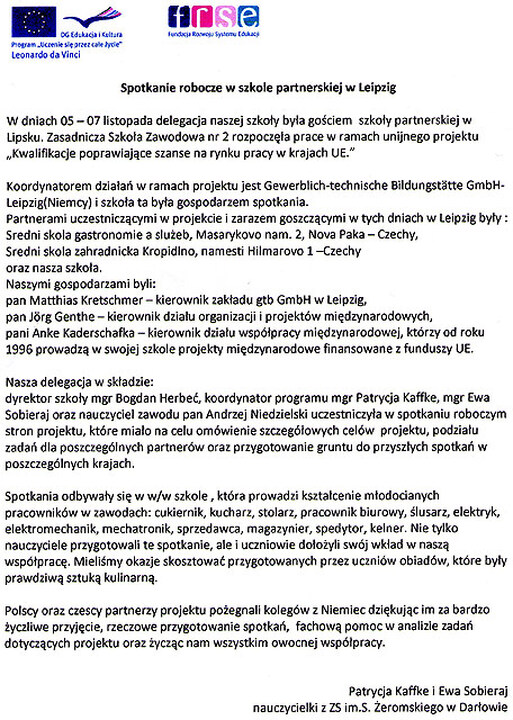 W dniach 05 - 07 listopada delegacja Zespołu Szkół im. S. Żeromskiego była gościem szkoły partnerskiej w Lipsku. Zasadnicza Szkota Zawodowa nr 2 rozpoczęła prace w ramach unijnego projektu: „Kwalifikacje poprawiające szanse na rynku pracy w krajach UE". Więcej na ten temat na załączonych fotografiach.