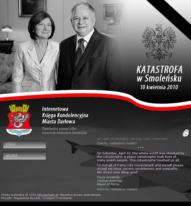 Ruszyła Internetowa Księga Kondolencyjna Miasta Darłowa poświecona pamięci ofiar katastrofy lotniczej w Smoleńsku. Każdy może wyrazić swoje odczucia i myśli, jakie towarzyszą mu w związku z tym wydarzeniem. W internetowym wydaniu księgi cytowane są także wybrane wpisy złożone  w księdze kondolencyjnej znajdującej się w ratuszu oraz kondolencje przesłane do urzędu drogą elektroniczną. Internetowa księga opatrzona jest zdjęciami upamiętniającymi składanie wpisów przez mieszkańców miasta w urzędzie. Zapraszamy do składania swoich kondolencji za pomocą Internetu.