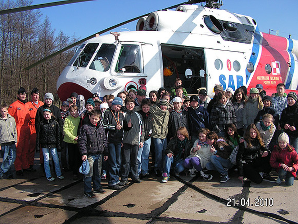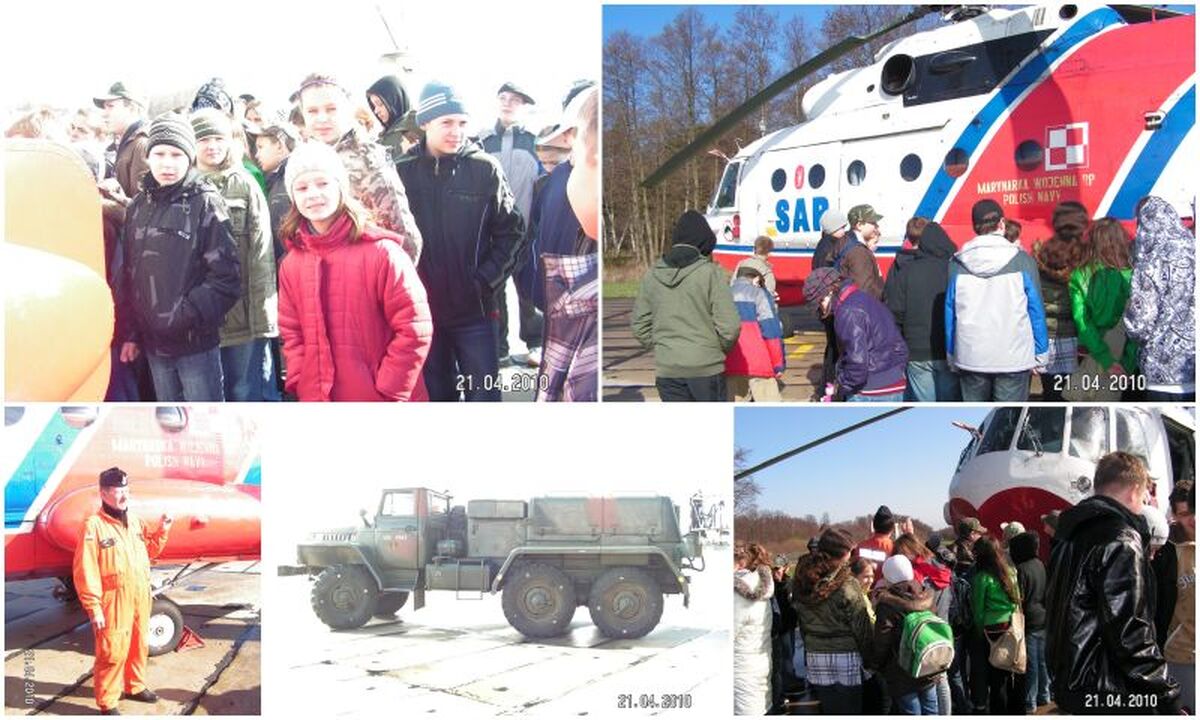 Dnia 21.04.2010 roku uczniowie naszej Szkoły odwiedzili 29 „Darłowską" Eskadrę Lotniczą w Darłówku. Chcieliśmy bliżej poznać codzienną pracę żołnierzy, zarówno lotników i ratowników, jak i ludzi zajmujących się obsługą śmigłowców. Uczniowie podzieleni na grupy wiekowe zwiedzali m.in. śmigłowce, wieżę kontroli lotów, Salę Tradycji w Klubie Garnizonowym. Dużym zainteresowaniem cieszyła się Sala Tradycji, w której oprócz kronik i tablic ze zdjęciami kolejnych dowódców jednostek, znajdują się modele śmigłowców i inne ciekawe eksponaty związane z lotnictwem morskim. Są tam też kombinezony ratownika morskiego oraz lotnika, elementy wyposażenia technika pokładowego oraz wiele innych przedmiotów, które związane są ze służbą ratowniczą. Uczniowie mogli również zobaczyć aparat fotograficzny z początków XX wieku. Kolejnym punktem zwiedzania był port lotniczy. Tam z bliska mogliśmy obejrzeć śmigłowiec, zobaczyć, jaki jest duży, dowiedzieć się ile waży i ile spala paliwa. Żołnierze ratownicy opowiedzieli o swojej trudnej i niebezpiecznej pracy. Następnie przeszliśmy do wojskowego portu lotniczego zwanego potocznie wieżą kontroli lotów. Tam, obsada stacji meteorologicznej przedstawiła nam prognozę pogody na najbliższe dni oraz opowiedziała o swojej pracy. W punkcie kontrolnym, na monitorach komputerów, mogliśmy śledzić tory lotów w korytarzach powietrznych.