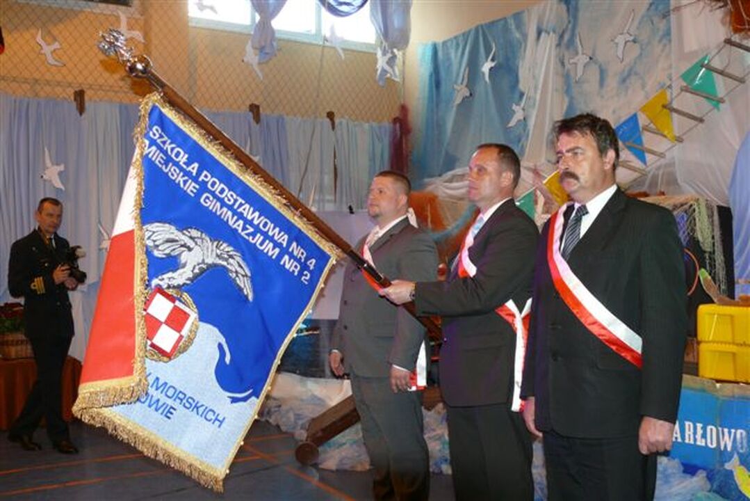 Z chlubną historią lotnictwa morskiego w Darłowie, licząca już 43 lata zapoznali zebranych uczniowie Adrian i Nicola. Następnie przewodniczący RM Darłowa - Zbigniew Grosz odczytał dwie uchwały RM o nadaniu szkołom im. Lotników Morskich. Przekazania sztandaru dyrektorce Zespołu Szkół dokonał przewodniczący Rady Rodziców Arkadiusz Sip. Dyrektorka przekazała sztandar szkolny Pocztowi Sztandarowemu. Na awersie sztandaru na biało-czerwonym tle widnieje godło RP i napis Bóg, Honor, Ojczyzna. Na rewersie znajduje się odznaka Lotników i napisy SP nr 4 i Gimnazjum nr 2 im. Lotników Morskich. Po ceremonii wręczenia sztandaru odbyło się ślubowanie uczniów SP i gimnazjalistów.