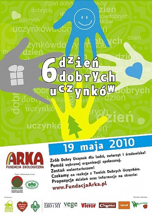 Fundacja ekologiczna ARKA wraz z partnerami organizuje 19 maja VI Dzień Dobrych Uczynków. Ideą jest to, aby wszyscy, zwłaszcza najmłodsi, uświadomili sobie możliwość zrobienia czegoś dobrego dla ludzi, zwierząt i środowiska. W akcję pod hasłem „Dobre uczynki dla ludzi, zwierząt i środowiska" zaangażowanych jest kilkaset szkół i organizacji z całej Polski, w tym również z Darłowa. Organizują m.in. zbiórki zabawek, książek i upominków dla domów dziecka, domów pomocy społecznej, świetlic środowiskowych. I Ty bezinteresownie zrób coś dobrego, pożytecznego czy miłego. Jak się włączyć? Wystarczy trochę posprzątać teren, posegregować zebrane odpady, posadzić drzewko lub kwiatek, nakarmić bezdomnego psa albo zabawić się w „Niewidzialną Rękę".