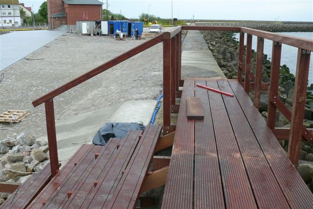 Na betonowym brzegowym falochronie na wschód od Latarni Morskiej trwa budowa dwupoziomowych pomostów spacerowych ze schodami i siedziskami. Promenada jest wykonywana z drzewa egzotycznego bangkirai. Ten gatunek bardzo twardego, odpornego na ścieranie i warunki atmosferyczne drewna rośnie w Indonezji, Malezji i Filipinach. Jego struktura jest tak zwarta, że rzucone do wody tonie. Promenada składa się z pomostu dolnego o długości 168 m i górnego o długości 156 m. Od strony morza na całej swej długości pomost jest zabezpieczony balustradą o wysokości 110 cm. Umożliwi on podziwianie nadmorskich widoków w szerokiej perspektywie i spacerowanie po szczycie falochronu. W pewnej części wyższy poziom pomostu będzie miał siedziska do opalania się. Na poszczególnych odcinkach falochron między poziomem pierwszym i drugim zabudowany będzie drewnianymi siedziskami, które na wysokości boiska do beach soccer i siatkówki plażowej wykorzystane mogą zostać jako trybuny dla widzów. Wejście i zejście na pomosty umożliwią drewniane schody.
