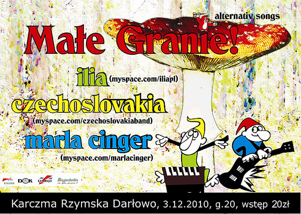 MAŁE GRANIE to mini fest alternatywnej trójmiejskiej muzyki. Festiwal wystartował w sopockiej Papryce by z czasem objąć inne miejscowości północnej Polski, takie jak np. Gdańsk, Słupsk czy Darłowo. Wezmą w nim udział trzy zespoły, które łączy własny pomysł na muzykę, oryginalne teksty a przede wszystkim kameralność składów i dźwięków. Wszyscy swoich korzeni dopatrują się w fascynacji estetyką Lo-Fi a ich muzyka jest dowodem na to, że naturalność, domowe brzmienie i głosy bez szerokich skal, za to z pomysłem potrafią poruszać. Marla Cinger i Ilia to muzyka kobieca z oddechem i przestrzenią, chodząca własną, intymną ścieżką natomiast Czechoslovakia to dźwięki zdecydowanie męske: szorstkie i jednocześnie dziecinnie rozmarzone. Połączenie tych żywiołów w takich proporcjach powinno zrodzić ciekawy wieczór.