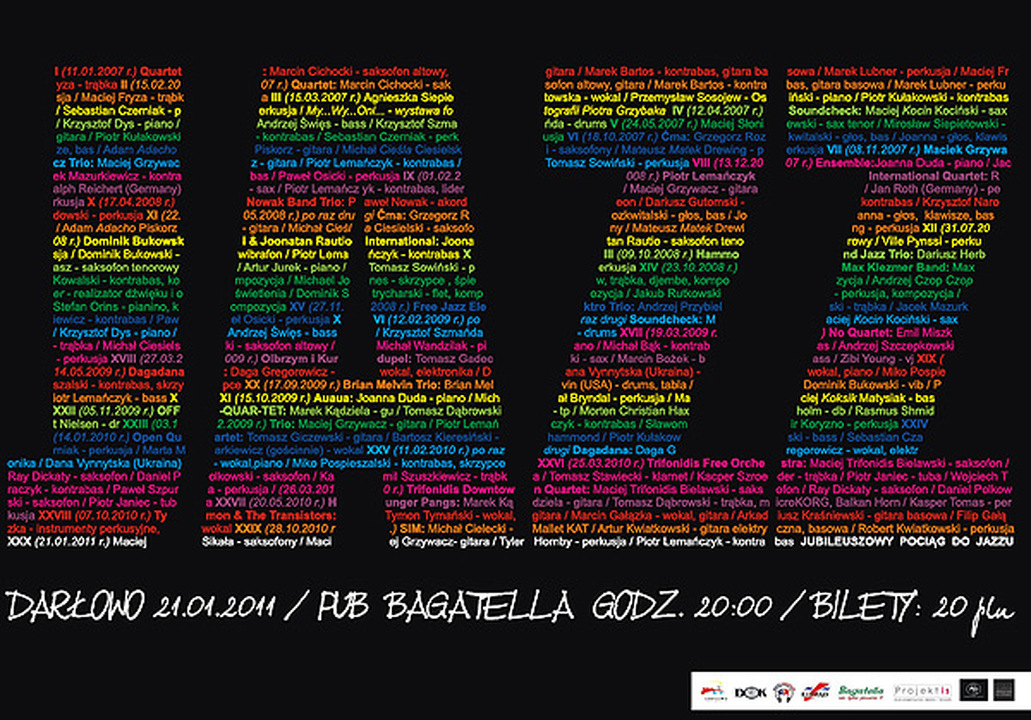 W styczniu mija czwarty rok trwania inicjatywy pod nazwa Czwartkowy Pociąg do Jazzu. Zaczęło się od koncertu 11 stycznia 2007 roku,  kiedy czwórka  darłowskich  muzyków - Maciek Fryza, Marek  Lubner, Marcin Cichocki oraz Marek Bartos pierwszymi dźwiękami w piwnicy Pubu Bagatella powołali do życia cykl jazzowych koncertów. Ruszył „Pociąg do Jazzu". Kolejne koncerty   jak doczepiane  „wagony"  prezentowały  coraz to nowe  składy muzyków i gościły podróżujących  słuchaczy. Przez 4 lata odbyło  się 29 koncertów  z czego 6 to grupy międzynarodowe, w których grali muzycy z różnych zakątków europy jak również ameryki. O tym, że grają  jazz w Darłowie jest już głośno, mówiono o tym m.in. w Drugim Programie Polskiego Radia.  Wieść tą szerzą muzycy odwiedzający piwnice Bagatelli jak również ludzie, którzy czasem przyjeżdżają z okolicznych miast na koncerty. Klimat CZ.P.d.J. tworzą przede wszystkim słuchacze, w następnej kolejności muzycy oraz miejsce, które niewątpliwie się przyjęło. Pub Bagatella udostępnia Pan Dariusz Kos, który pomaga w organizacji  koncertów, a także zapowiada grające zespoły.