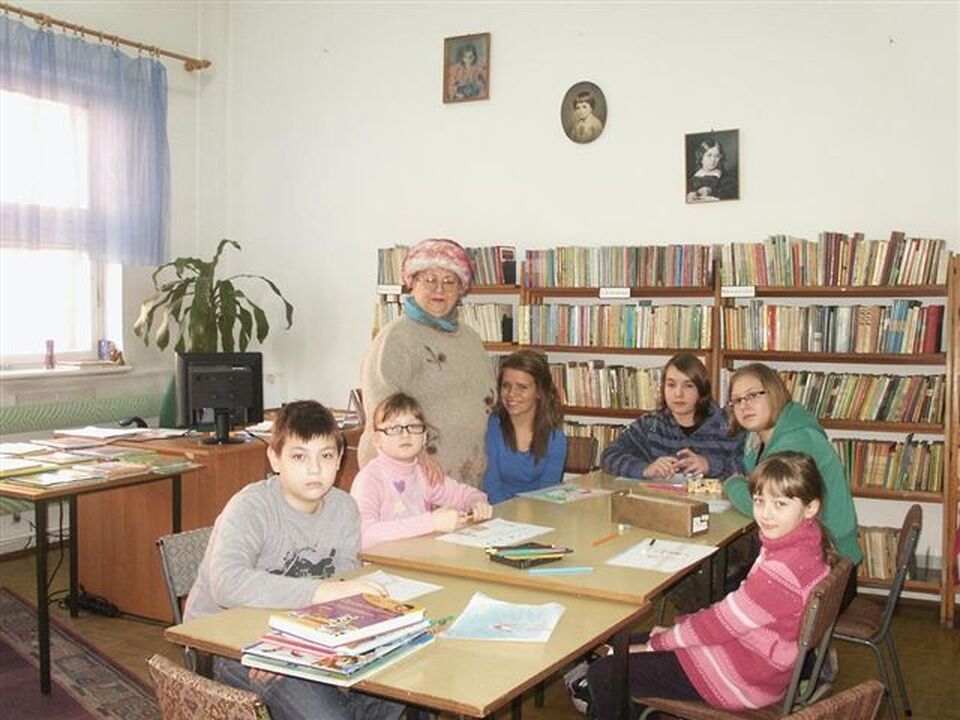 Na fot. pani Urszula z bibliotekarkami, z dziećmi w bibliotece podczas zajęć feryjnych i z dyr. biblioteki - Krystyną Krakowiak.