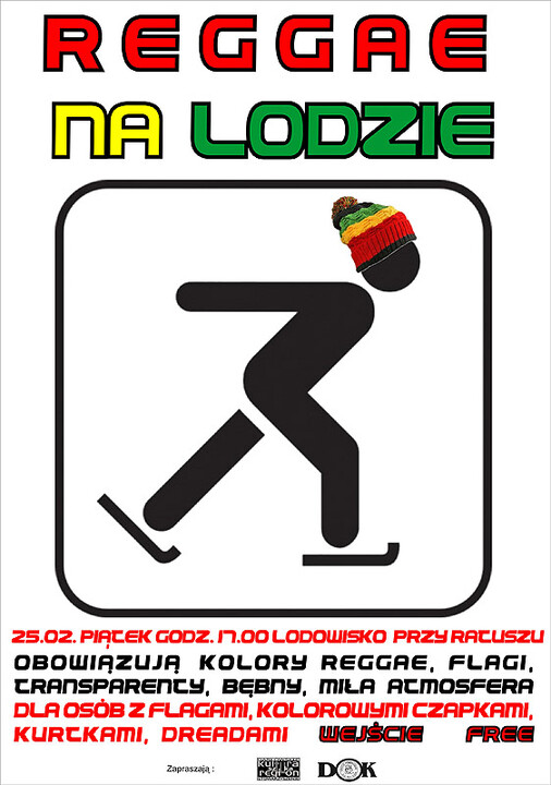 Darłowskie Stowarzyszenie Kultura Sztuka Region w najbliższy piątek tj. 25.02.2011 zaprasza na akcję muzyczno-rekreacyjną pn.: „Reggae na lodzie". Odbędzie się ona na lodowisku miejskim w Darłowie (Rynek Miejski) o godzinie 17:00. Obowiązują kolory reggae!!! Mile widziane bębny, transparenty, kolorowe czapki, flagi, łyżwy, dobre humory i miła atmosfera.