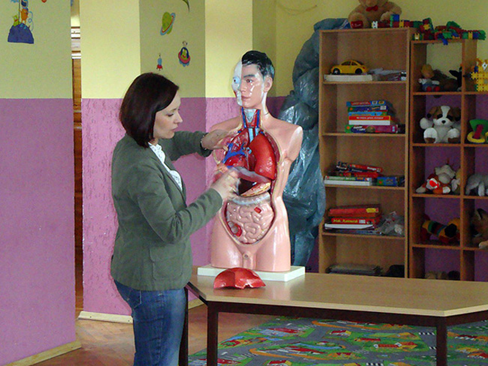 Prowadząca pokaz wykorzystała model torsu człowieka z wyjmowanymi organami, dzięki czemu dzieci dowiedziały się i zobaczyły na własne oczy, jak wyglądają płuca, mózg, serce i inne organy oraz, w którym miejscu się one znajdują. Mogły je także wziąć do ręki, dotknąć i porównać. Takie praktyczne metody nauczania zostawiają w głowach młodych ludzi najtrwalsze ślady. Widać to było po zainteresowaniu uczestników tematem oraz czynnym udziale w spotkaniu. Na zakończenie prelekcji dzieci bardzo trafnie odpowiadały na pytania utrwalające wiedzę, udowadniając tym samym, że nie „przespali" tej ważnej dla nich lekcji.