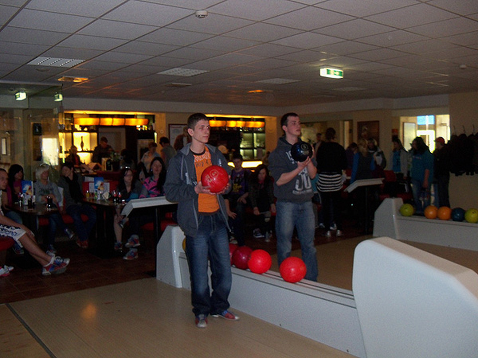 Uczniowie wizytę partnerską rozpoczęli integracyjną grą zespołową w kręgle. Uczniowie utworzyli cztery mieszane zespoły i wspólnie z opiekunami rozegrali w bardzo wesołej atmosferze zaciekłe pojedynki.