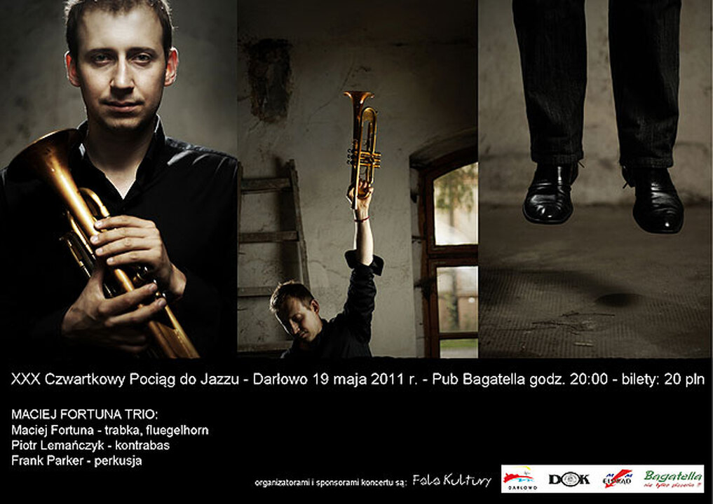 Darłowski Ośrodek Kultury oraz Fala Kultury serdecznie zapraszają w dniu dzisiejszym (tj. 19 maja) o godzinie 20:00 do darłowskiego Pubu Bagatella, gdzie odbędzie się długo oczekiwany koncert: Maciej Fortuna Trio w składzie: Maciej Fortuna (trąbka), Frank Parker (perkusja) oraz Piotr Lemańczyk (kontrabas).