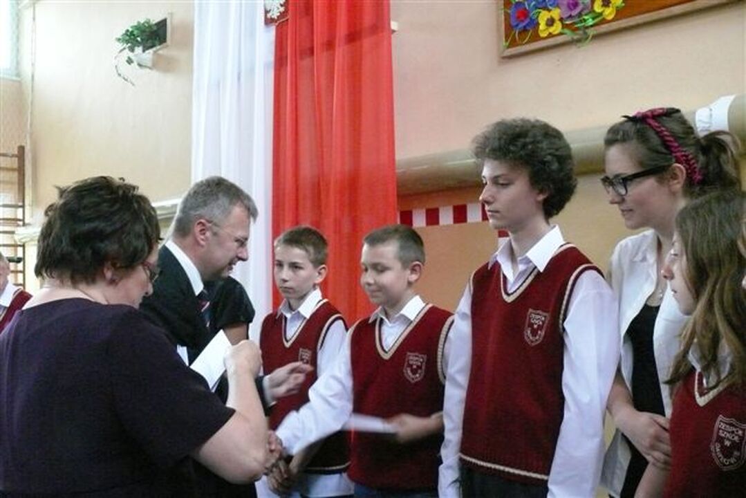 Arkadiusz Klimowicz - burmistrz miasta Darłowa podziękował gronu pedagogicznemu i pracownikom szkoły za ich wkład w wychowanie młodego pokolenia i osiągnięcie dobrych rezultatów. Dziękował również rodzicom za podjęcie inicjatywy utworzenia z nowym rokiem szkolnym 2011/2012 Zespołu Szkół Społecznych, który będzie podlegał Społecznemu Stowarzyszeniu Oświatowemu.  Burmistrz obiecał Bożenie Tatuśko, która będzie zarządzać nową placówką szkolną pomoc w realizacji zadań oświatowych i wychowawczych. Deklarację tę przyjęto owacyjnie. Następnie ojciec miasta wręczył najlepszym uczniom stypendia.  Natomiast wychowawcy klas i dyrektorka szkoły wręczyły najlepszym uczniom nagrody książkowe, a rodzicom podziękowania i kwiaty. Życzeniom dalszych osiągnięć, podziękowaniom za współpracę nie było końca. To szczególne  spotkanie było ostatnią uroczystością w Zespole Szkół, jako jednostce podlegającej darłowskiemu samorządowi.  Po rozdaniu świadectw rozpoczęły się wakacje.