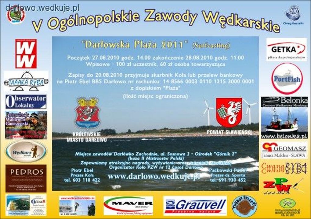 Koło PZW Darłowo zaprasza na kolejne już zawody z cyklu Darłowska Plaża 2011. Swoj udział potwierdzili Holger Kobarg - jeden z najlepszych wedkrzy morskich w Niemczech, z wielkimi doświadczeniami wędkarskimi (narodowymi i międzynarodowymi), takimi jak 7-mio krotny mistrz Niemiec, 2 krotny mistrz europy, wicemistrz świata, wieloletni wędkarz grupy Grauvell-Team-Deutschland jak rowniez nasi mistrzowie. Mistrz Polski z roku 2010 Wieslaw Dawicki oraz aktualny Mistrz Polski Rafał Udziela.Spodziewamy sie również wielu innych wspaniałych wędkarzy wraz z osobami towarzyszącymi. W tym roku podjeliśmy decyzje by zawody przeprowadzić na plaży zachodniej Darłówka. Kto już był na poprzednich edycjach Darłowskiej Plaży ten wie że słowo ZAWODY jest na wyrost. Darłowska Plaża ma charakter imprezy integracyjnej która ma na celuzabawę w wędkarstwo jak też spotkanie towarzyskie. Zwieńczeniem imprezy zawsze są atrakcyjnenagrody ale największą nagrodą są nowe znajomości zawiązujące się podczas trwania zawodów i niepowtarzalny klimat o który na każdym kroku dbają organizatorzy .
