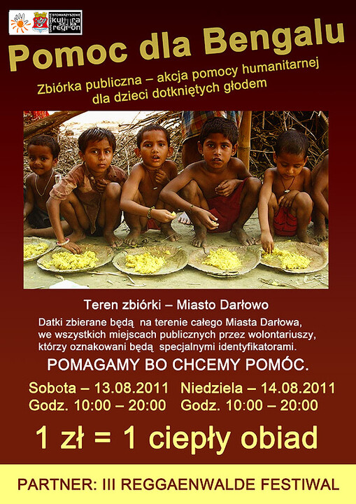 Z przyjemnością informujemy, że Darłowskie Centrum Wolontariatu objęło patronatem i wsparciem organizację misji pomocy dla mieszkańców Bengalu. W publiczną akcję charytatywną zbiórki środków finansowych oficjalnie - włączyło się ponadto: Miasto Darłowo oraz Stowarzyszenie Kultura Sztuka Region. Zostanie ona przeprowadzona w dniach 13 - 14 sierpnia 2011 podczas dwudniowej imprezy pod nazwą III REGGAENWALDE FESTIWAL, którego pomysłodawcą oraz głównym realizatorem jest Robert Gorgol.