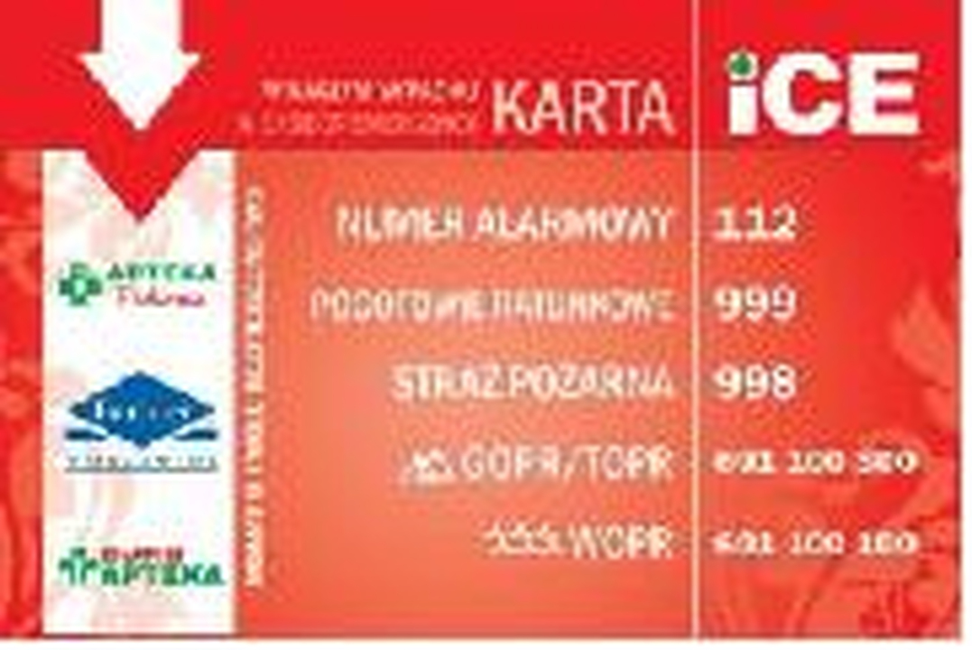 Pomysł kart ICE (In Case of Emergency) oznacza „w nagłym wypadku" powstał z inicjatywy włoskich ratowników, którzy zauważyli lukę informacyjną w kontakcie z rodziną i bliskimi poszkodowanych. W sytuacji wypadku czy innego zagrożenia nasi bliscy często nie wiedzą, co się wydarzyło i gdzie się znajdujemy. Dlatego warto mieć zapisanych kilka ważnych informacji na karcie ICE. Jest to trwała, plastikowa karta wielkością przypominająca zwykłą kartę płatniczą, z imieniem i nazwiskiem właściciela oraz 2 numerami do naszych najbliższych osób, które należy powiadomić w razie wypadku. Osoby podane do kontaktu powinny umieć udzielić informacji o stanie zdrowia właściciela karty.