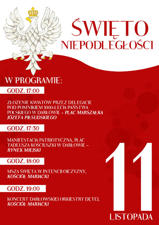 Z okazji rocznicy odzyskania przez Polskę Niepodległości w dniu 11 listopada 2011 roku zapraszamy mieszkańców ziemi darłowskiej do wspólnego uczczenia tego wielkiego wydarzenia.