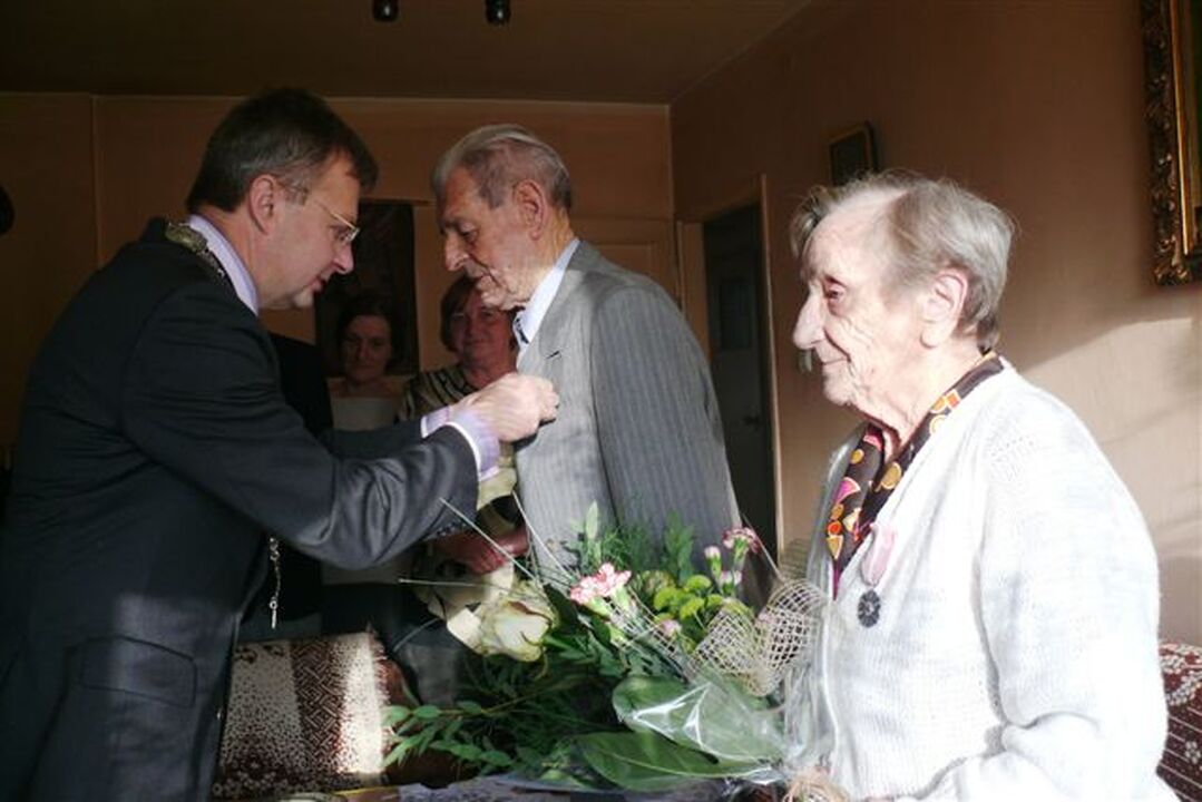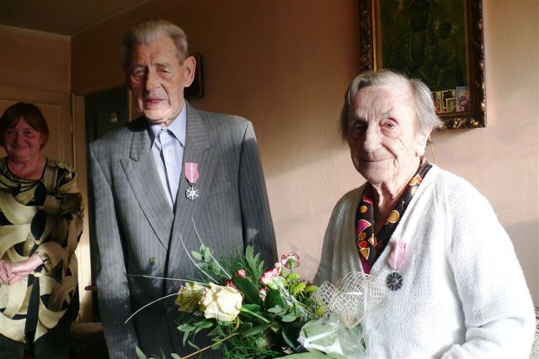 Z okazji jubileuszu Arkadiusz Klimowicz - burmistrz miasta Darłowo i Halina Gałuszka kierownik Urzędu Stanu Cywilnego w Darłowie złożyli wizytę w domu jubilatów. Burmistrz w imieniu Prezydenta RP uhonorował ich medalami za Długoletnie Pożycie Małżeńskie oraz wręczył kwiaty i okolicznościowy list gratulacyjny. Życzeniom zdrowia i szczęścia nie było końca.