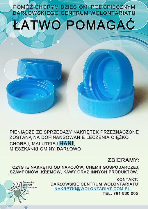 Zapraszamy wszystkich, którzy uzbierali małe i duże worki plastikowych nakrętek oraz tych, którzy chcieliby uzyskać więcej informacji na temat zbiórki,  do budynku Miejskiego Zarządu Budynków Komunalnych mieszczącego się przy ulicy 1-go Maja w Darłowie. Celem zbiórki jest pomoc małej Hani - podopiecznej Darłowskiego Centrum Wolontariatu.