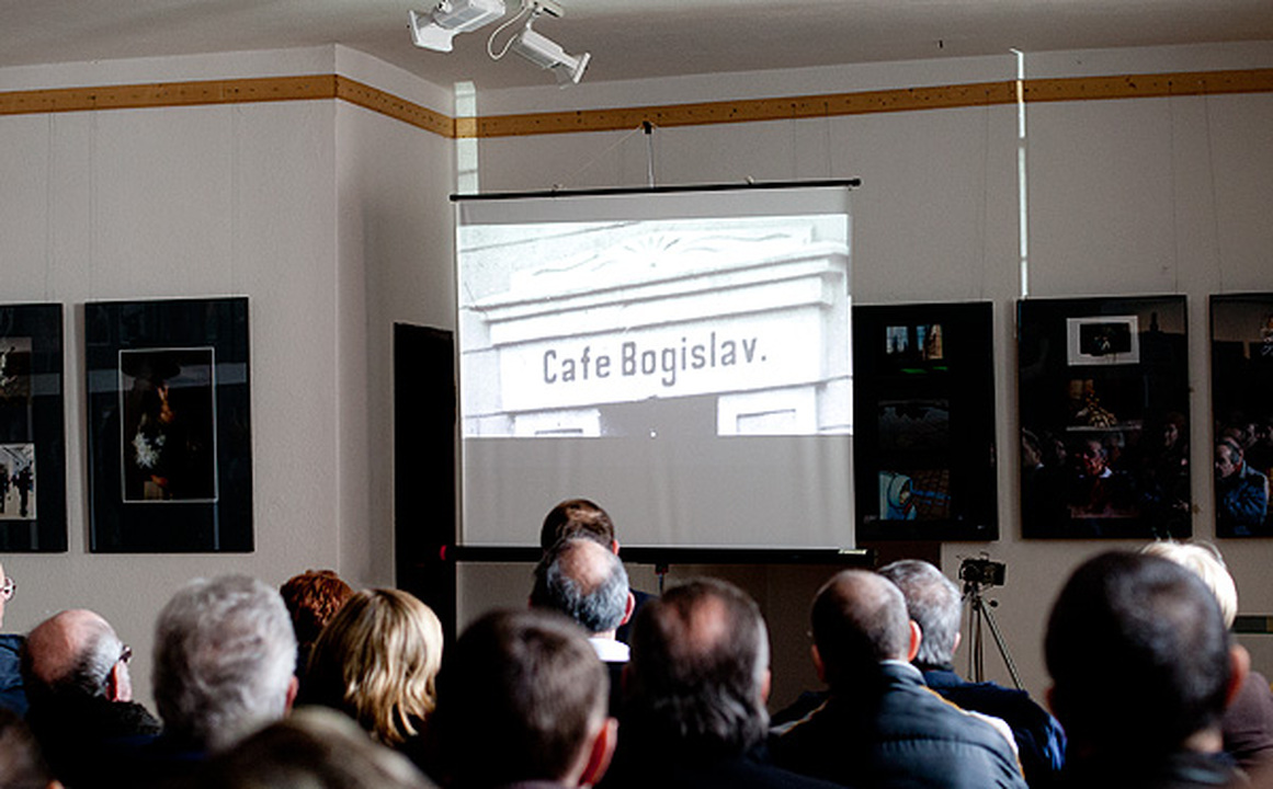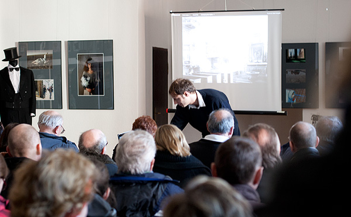 Następnie, po raz pierwszy w pokazie slajdów zaprezentowano zdjęcia, które zabrały przybyłych w niezwykłą, fascynująca podróż w czasie - do „brukowanego" Darłowa,  gdzie przy budynkach mieszkalnych zamiast aut zaparkowane były wozy - Darłowa sprzed 100 lat. Prezentacja angażowała przybyłych gości do dyskusji. Wspólnie odkrywano miejsca, które zostały sfotografowane - i nie było to zadanie łatwe, szczególnie dla przybyłej młodzieży. Niektóre z pokazanych miejsc uległy tak dużym zmianom wizualnym, że trudno je było teraźniejszym umiejscawiać w Darłowie lub też nie przetrwały do dnia dzisiejszego i nie pozostał po nich nawet najmniejszy ślad.  Fotograficzne zagadki pomagali odkrywać m.in. Ewa Bielecka, Jan Skórski, Ryszard Mroziński, Jan Górski.