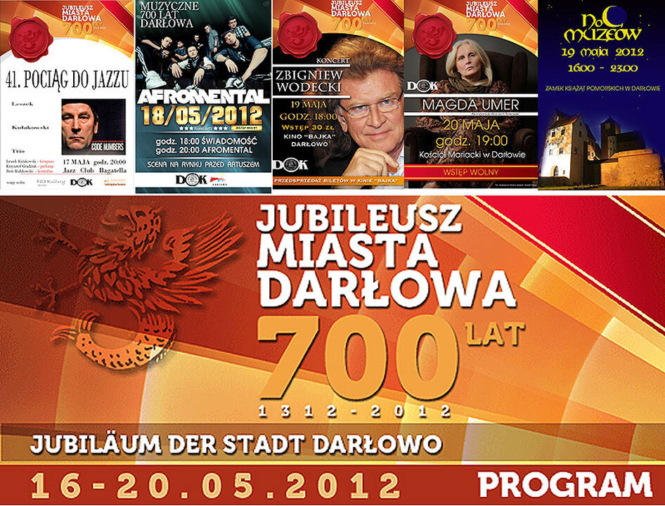Najbliższy tydzień będzie obfitował w wiele imprez przygotowanych specjalnie na okoliczność Jubileuszu Miasta Darłowa - 700 lat (1312-2012). W ramach oficjalnych obchodów rocznicy drugiej lokacji miasta przygotowano szereg atrakcji, które powinny zaspokoić nawet najbardziej wysublimowane gusta.