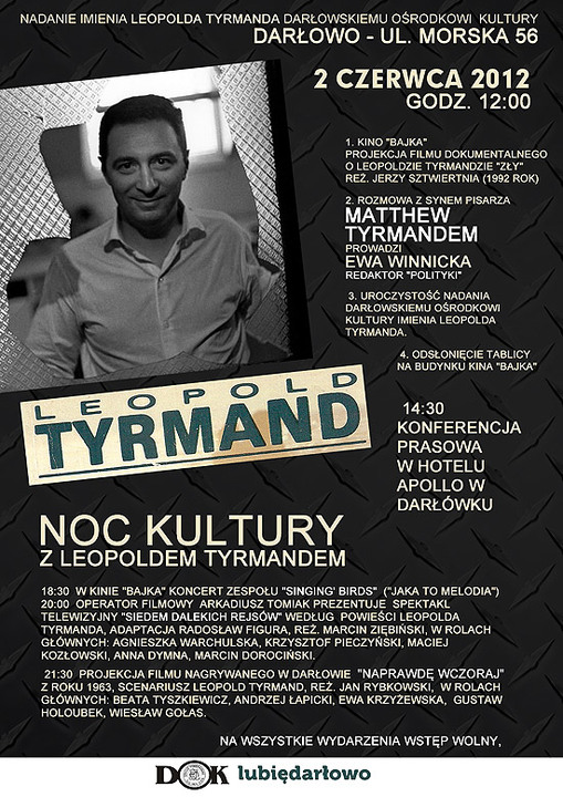 Darłowski Ośrodek Kultury serdecznie zaprasza 2 czerwca 2012 roku (tj. sobota) na oficjalne uroczystości związane z nadaniem imienia Leopolda Tyrmanda darłowskiej instytucji kultury.