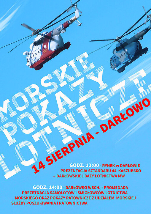 Serdecznie zapraszamy do Darłowa na jedyne w Polsce pokazy lotnicze nad morzem. Odbędą się one z okazji 50-lecia istnienia w Darłowie Marynarki Wojennej i powiązane będą z prezentacją nowego sztandaru 44. Bazy Lotnictwa Morskiego.