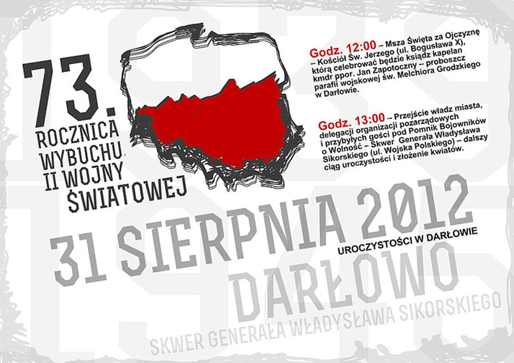 31 sierpnia w wigilię 73. Rocznicy Wybuchu II Wojny Światowej w Darłowie odbędą się uroczystości upamiętniające to wydarzenie. Z tej okazji o godzinie 12:00 w Kościele Św. Jerzego - odprawiona zostanie uroczysta Msza Święta za Ojczyznę. Tuż po niej (godz. 13:00) władze samorządu wraz z delegacjami jednostek samorządowych, organizacji pozarządowych oraz przybyłymi gośćmi przejdą pod obelisk przy ul. Wojska Polskiego (Pomnik Bojowników o Wolność - Skwer Generała Władysława Sikorskiego) - gdzie odbędzie się dalsza część uroczystości oraz złożenie kwiatów.
