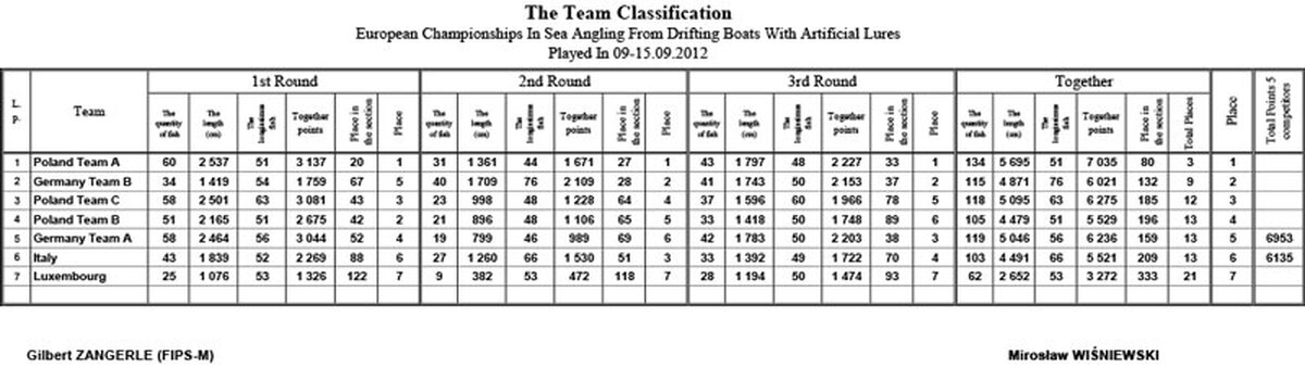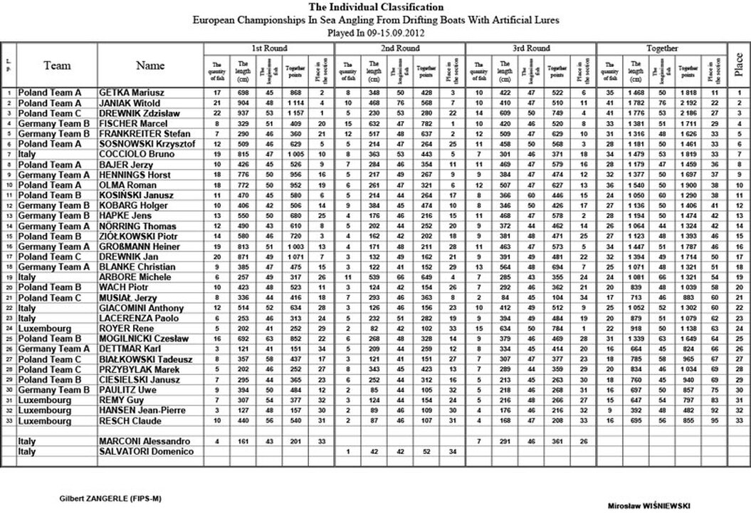 Klasyfikacja indywidualnaKlasyfikacja drużynowaMistrzostwa Europy w wędkarstwie - klasyfikacja oficjalnaMistrzostwa Europy w wędkarstwie - klasyfikacja oficjalnaMistrzostwa Europy w wędkarstwie - klasyfikacja oficjalnaMistrzostwa Europy w wędkarstwie - klasyfikacja oficjalna