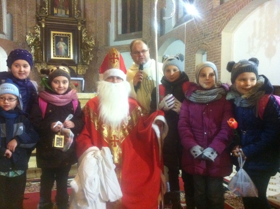 Dziś rano święty biskup Mikołaj dotarł z Turcji do darłowskiego kościoła mariackiego. Spotkał się z dziećmi, które licznie przyszły o godzinie szóstej na roraty - tradycyjną adwentową poranną mszę świętą. Biskup Mikołaj dla każdego dziecka miał podarek - paczuszkę pełną słodkości. Zwyczaj obdarowywania dzieci 6 grudnia od lat podtrzymują darłowscy ojcowie franciszkanie kierowani już dziewiąty rok przez gwardiana klasztoru i proboszcza parafii o. Stanisława Piankowskiego.