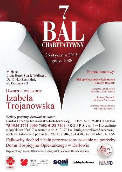 Tradycyjnie dochód z zabawy będzie przeznaczony na potrzeby Domu Hospicyjno - Opiekuńczego w Darłowie. W trakcie balu odbędą się licytacje oraz sprzedaż cegiełek. Zabawe do białego rana umili zespół muzyczny "ON - OFF". Gwiazdą wieczoru bedzie aktorka i piosenkarka - Izabela Trojanowska.