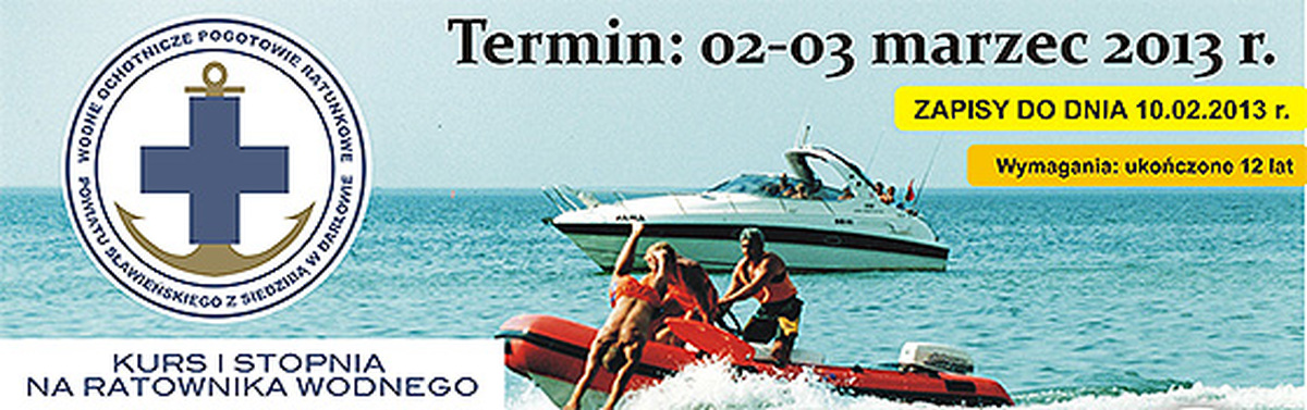 Wodne Ochotnicze Pogotowie Ratunkowe Powiatu Sławieńskiego z siedzibą w Darłowie informuje, że w dniach 2-3 marca 2013 roku odbędzie się kurs I stopnia na ratownika wodnego.