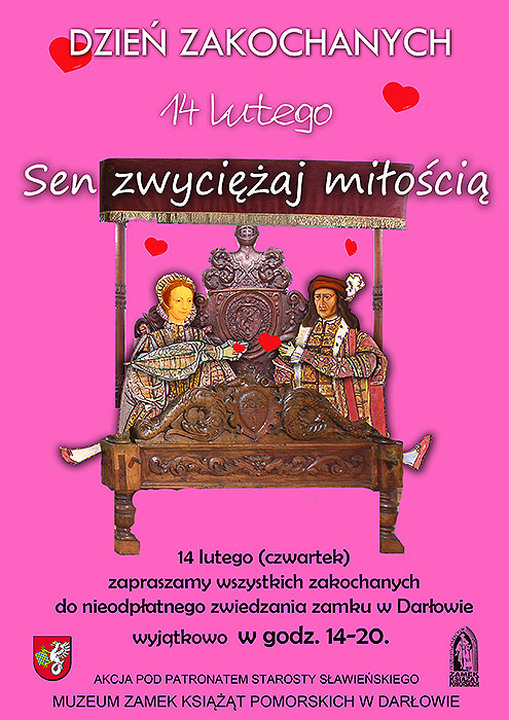 „Sen zwyciężaj miłością" - taka sentencja w języku łacińskim jest w wezgłowiu łoża w sypialni książęcej na naszym zamku. I taki też jest tytuł akcji, którą dedykujemy zakochanym w dniu ich święta 14 lutego. Tego dnia zapraszamy wszystkich zakochanych do nieodpłatnego zwiedzania zamku w Darłowie wyjątkowo w godz. 14-20.