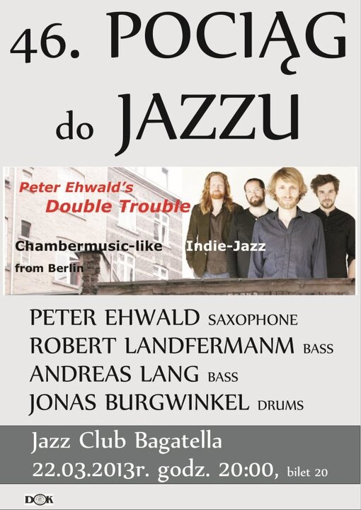 Na europejskiej trasie Peter Ehwald's Double Trouble, będzie to jedyny występ w naszym kraju,  zarazem to 46 koncert, trwającego już ponad 6 lat zjawiskowego cyklu Pociąg do Jazzu, prezentującego muzykę improwizowaną i jazzową na najwyższym europejskim i światowym poziomie. Jazz to muzyka bezpośredniego doświadczenia, kontaktu z publicznością, również a może przede wszystkim z niego budująca swój efemeryczny urok, wszystkich serdecznie zapraszamy.