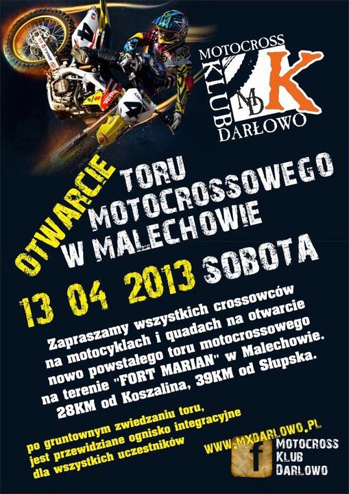 Motocross Klub Darłowo ma zaszczyt zaprosić wszystkich crossowców na motocyklach i quadach na otwarcie nowo powstałego toru motocrossowego na terenie "FORT MARIAN" w Malechowie. Po gruntownym zwiedzaniu toru, jest przewidziane ognisko integracyjne dla wszystkich uczestników.