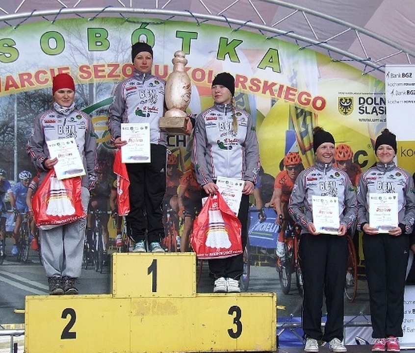 Jak nas informuje Artur Szarycz w miniony weekend na drogach Dolnego Śląska, tradycyjnie zainaugurowano szosowy sezon kolarski w polskim peletonie. W dwóch dużych imprezach o zasięgu międzynarodowym, w których udział wzięło ponad 600 zawodników obok kolarzy z Polski, Niemiec, Czech i Litwy startowały nasze kolarki. Pomimo niesprzyjającej aury w pierwszym dniu zmagań w Kryterium Ulicznym w Dzierżoniowie, gdzie trasa wyznaczona była na pętlach 1500 metrowych w centrum miasta, nasze kolarki dały popis jazdy. Juniorki młodsze znakomicie rozpracowały rywalki nacisnęły mocno na pedały i zdobyły trzy pierwsze miejsca na mecie. Zwycięstwo po indywidualnym ataku w pięknym stylu odniosła Patrycja Jasińska, na drugiej lokacie uplasowała się Daria Pikulik a podium uzupełniła Marlena Karwacka.                                                           Ponadto świetnie pojechały pozostałe zawodniczki debiutujące w tej kategorii. Klaudia Seremak była 5, Patrycja Scholz 8, a Wiktoria Pikulik 13. Bardzo dobrze wypadły również młodziczki. Na drugim miejscu finiszowała Karina Topolska, tuż za podium Wiktoria Konopka a na piątym i szóstym miejscu kolejno Patrycja Seremak i Pamela Danilczuk, na 13 miejscu rywalizację ukończyła Wanesa Kącka. Równie dobrze wypadły juniorki gdzie świetnie tego dnia finiszowała Patrycja Jacyszyn wygrywając klasyfikacje juniorek oraz klasyfikując się na znakomitym 5 miejscu wśród elity. Druga lokata przypadła mistrzyni Polski juniorek Karolinie Komoś, a najniższy stopień podium Agacie Drozdek. Kolejne trzy miejsca 4-6 również zdobyły darłowianki: 4 Bogumiła Dziuba, 5 Monika Graczewska, 6 Weronika Lorkowska.