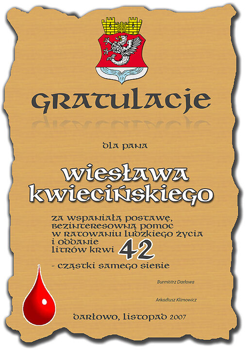 Na spotkanie z władzami samorządowymi miasta i powiatu przybyła liczna grupa Zasłużonych Honorowych Dawców Krwi. Oddali oni potrzebującym sporą cząstkę swojego życia: Bogusław Sulik – 43 litry krwi, Wiesław Kwieciński – 42, Dariusz Cieślak – 29, Michał Kuś – 23, Teresa Gadalińska – 20, Marian Michalak – 19, Zbigniew Muchowski – 19, Witold Pietrzak – 12, Monika Nowicka - 10 litrów krwi. Opiekunem z ramienia Służby zdrowia i długoletnim sekretarzem darłowskiego Klubu jest Wiktoria Walkowiak. Darłowski Klub Krwiodawstwa należy do najlepszych na Pomorzu Środkowym.