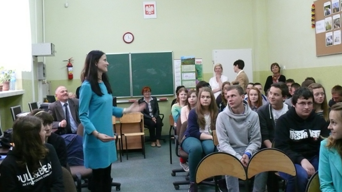Absolwentka politologii Uniwersytetu Adama Mickiewicza w Poznaniu do Szkoły Podstawowej chodziła w Darłowie. Obecnie, w tym budynku jest Miejskie Gimnazjum.  Spotkanie polegało głównie na zadawaniu pytań przez uczniów i nauczycieli oraz udzielaniu odpowiedzi przez dziennikarkę.