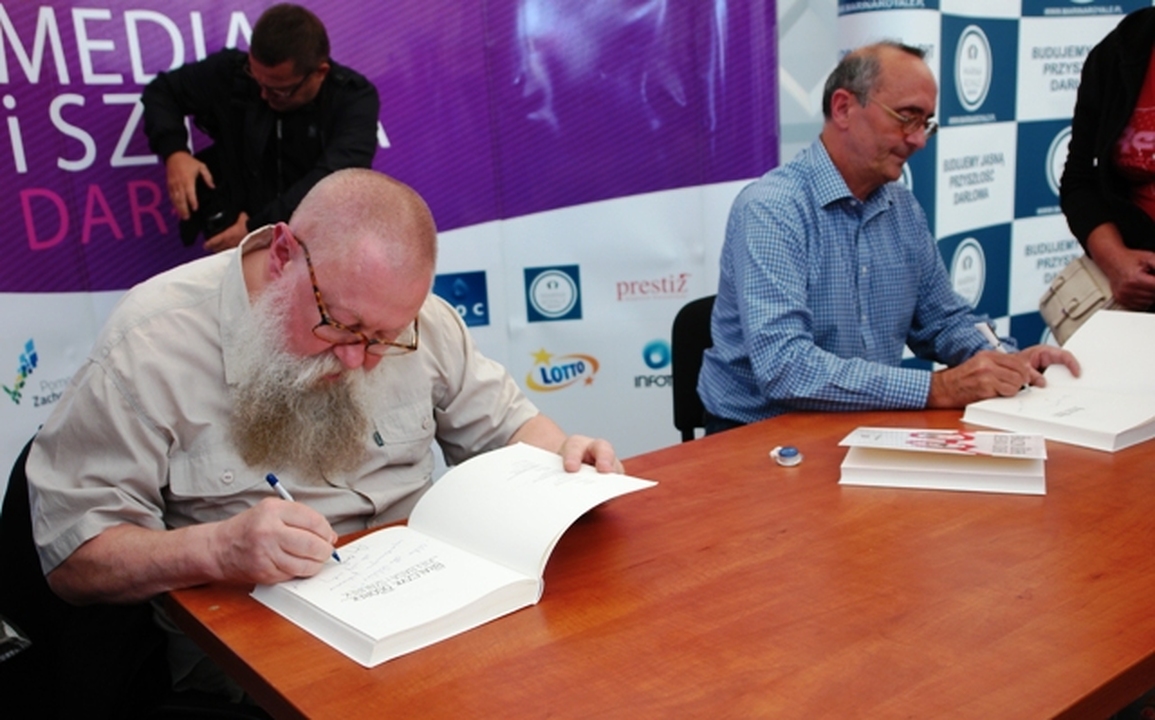 Prof. Jerzy Bralczyk, Anna Dziewit-Meller, Sławomir Kamiński, Marcin Kącki, Cezary Łazarewicz, Marek Niedźwiecki, Michał Ogórek, Daniel Passent, Wojciech Pszoniak, Małgorzata Purzyńska, Piotr Pytlakowski, Paweł Sito, Szczepan Twardoch, Ewa Winnicka, Jan Wróbel – to tylko część z lawiny znakomitych gości, którzy już pierwszego dnia wzięli udział w III Bałtyckim Festiwalu MEDIA I SZTUKA. Festiwal rozpoczął koncert kameralnego zespołu koszalińskich filharmoników La Donna e Mobile. Rozrywkowy repertuar, występ sopranistki Lucyny Górskiej i dowcipnie prowadzona konferansjerka przez Wojciecha Bałdysa wprowadziły w świetny humor licznie przybyłych widzów. Lekką i przyjemną atmosferę miało prowadzone na żywo spotkanie prof. Jerzego Bralczyka – językoznawcy oraz specjalisty w zakresie języka mediów, reklamy i polityki z satyrykiem i felietonistą z Gazety Wyborczej Michałem Ogórkiem. Obaj elokwentni i dowcipni panowie w roku ubiegłym wydali wspólnie napisaną książkę p.t. „Kiełbasa i sznurek”. Spore fragmenty (ponoć te najciekawsze) tej pełnej humoru ksiązki powstały w Darłowie. Po spotkaniu obaj autorzy podpisywali Czytelnikom swój bestseller. Z dziennikarzem, felietonistą, autorem książek i dyplomatą Danielem Passentem rozmawiali Ewa Winnicka – dziennikarka i autorka książek oraz Jan Wrobel- dziennikarz prasowy i radiowy, publicysta, autor podręcznika historii dla licealistów. W spotkaniu zatytułowanym „Passent rozebrany” dokonano rozbioru mistrza literackiego felietonu. Redaktor Polityki odpowiadając na pytania mówił o swoich przyjaciołach Janie Pietrzaku, z którym współpracował przez pewien okres w kabarecie pod Egidą i Elżbiecie Czyżewskiej aktorce filmowej i teatralnej, gdy ta przebywała w Stanach Zjednoczonych. Wspominał również słynnego tenisistę, biznesmena i kolekcjonera sztuki Wojciecha Fibaka.