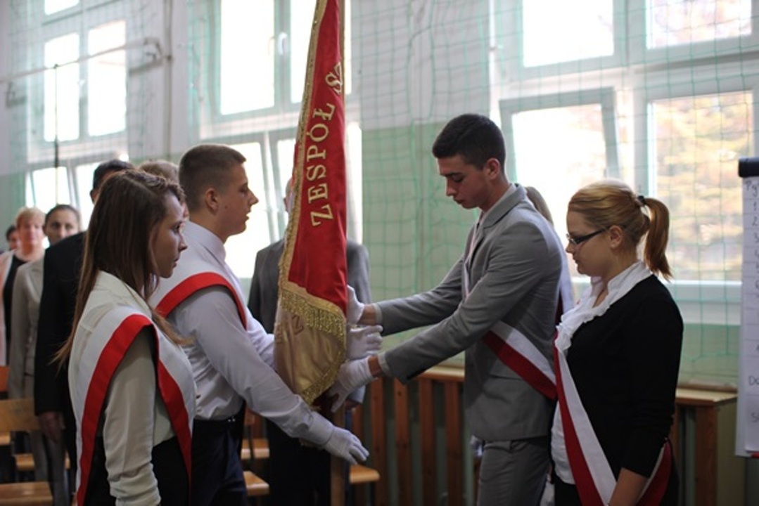 nastąpiło uroczyste przekazanie sztandaru. Po trzech latach godnego reprezentowania naszej szkoły, sztandar uczniom klas pierwszym przekazał dotychczasowy poczet sztandarowy, w skład którego wchodzili: Ada Kubicka, Patrycja Tomczyk