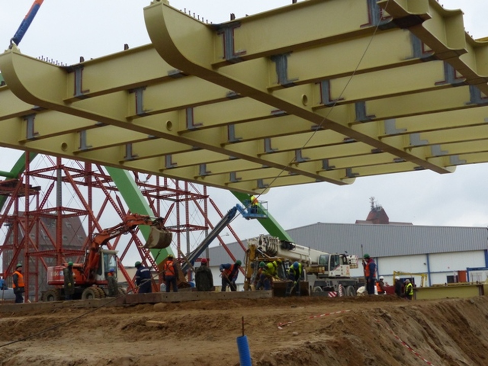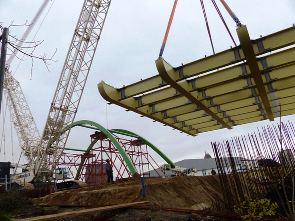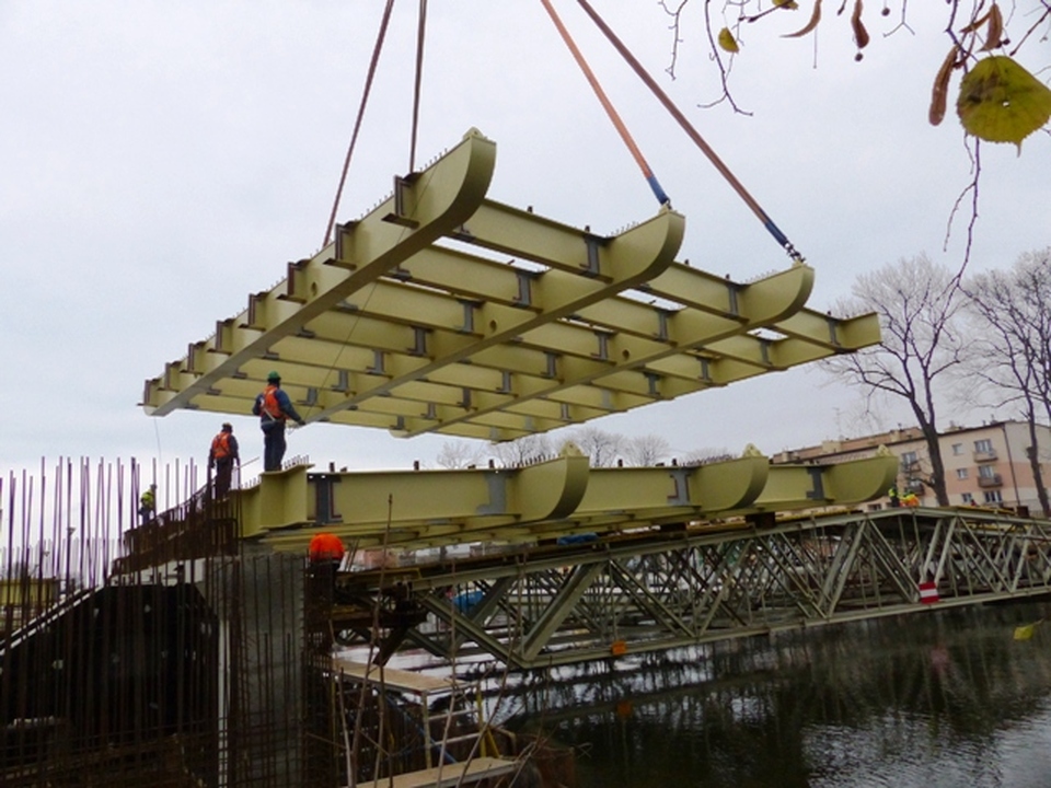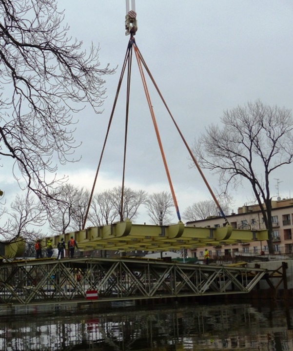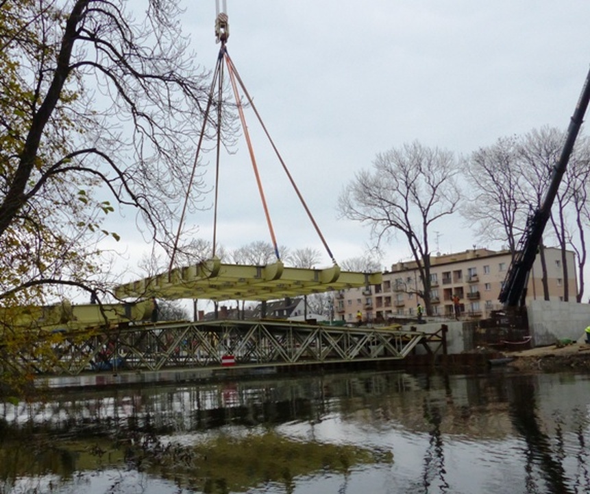 W miejscu, gdzie  do niedawna była przerzucona „kładka kutrowska” przedsiębiorstwo Promostal montuje na żelbetonowych przyczółkach most konstrukcji łukowej o rozpiętości 48 metrów, w tym 44 metry bezpośrednio nad rzeką. Do montażu trzech 60 tonowych przęseł i  dwóch łuków wykorzystuje się specjalnie sprowadzony dźwig samobieżny  na gąsienicach, który może podnieść ciężar o masie  500 ton. Jest to skomplikowana  operacja logistyczna. Po posadowieniu przęseł i łuków  most będzie scalony z  wykorzystaniem specjalnej konstrukcji pomocniczej.
