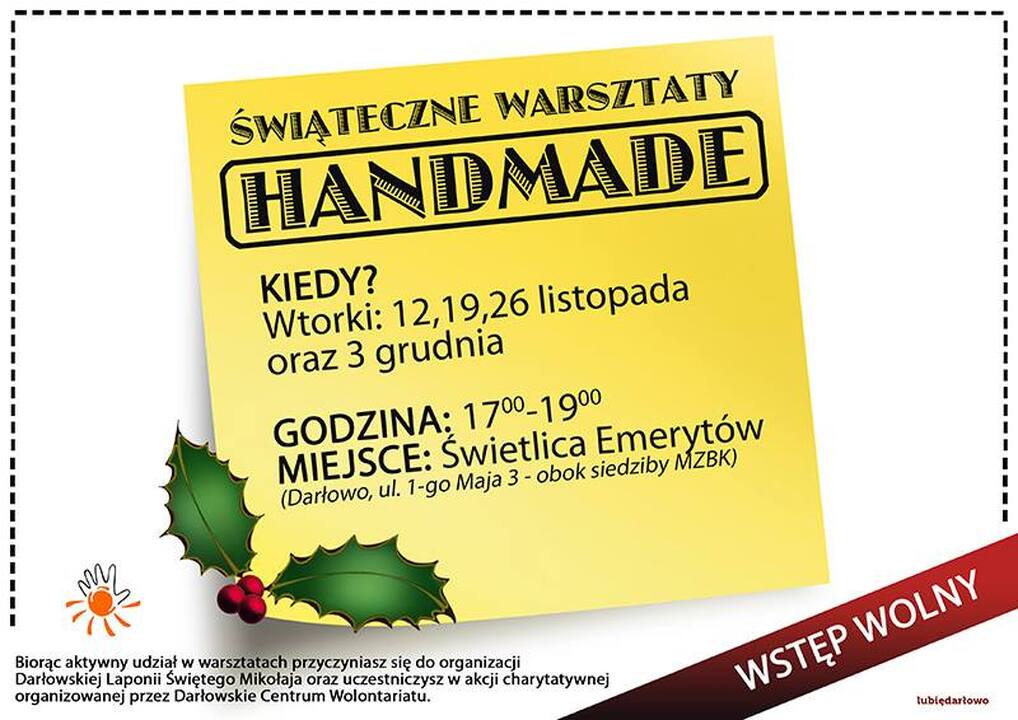 Darłowskie Centrum Wolontariatu ma przyjemność zaprosić mieszkańców Darłowa do udziału w ostatnich już, darmowych warsztatach rękodzielniczych - HANDMADE, które odbędą się we wtorek - 3 grudnia. Warsztaty o tematyce świątecznej poprowadzą wolontariusze, a zajęcia odbędą się w godzinach 17:00 - 19:00, w gościnnych progach świetlicy Związku Emerytów w Darłowie przy ul. 1-go Maja 3 (obok siedziby MZBK).