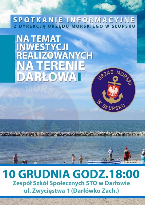 Informujemy, że 10 grudnia tj. wtorek o godz. 18:00 w Zespole Szkół Społecznych STO w Darłowie, przy ul. Zwycięstwa 1 (Darłówko Zachodnie) obędzie się spotkanie informacyjne z Dyrekcją Urzędu Morskiego w Słupsku nt. Inwestycji realizowanych na terenie Darłowa.