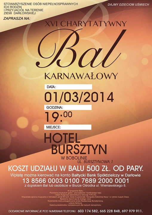 Zarząd Stowarzyszenia Osób Niepełnosprawnych w Darłowie serdecznie zaprasza na XVI Bal Charytatywny, który odbędzie się 1 marca 2014 roku w Centrum Rehabilitacyjnym SPA & WELLNESS „BURSZTYN" Halina Ślepko w Bobolinie (ul. Bursztynowa 1).  Bal rozpocznie się o godzinie 19.