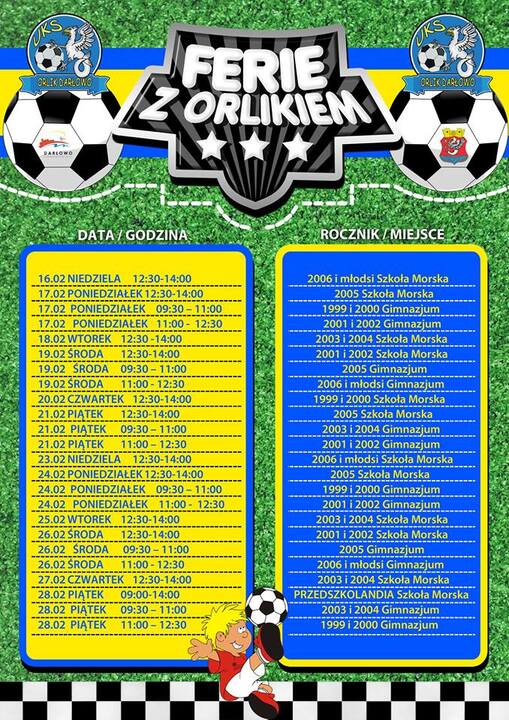 Ponadto w harmonogramie: ferie z Biblioteką Miejsą, owarte treningi UKS Orlik, ferie z Miejskim Gimnazjum w Darłowie, Zespołem Szkół Społecznych STO, Zespołem Szkół im. Stefana Żeromskiego, KS Stocznia M&W.