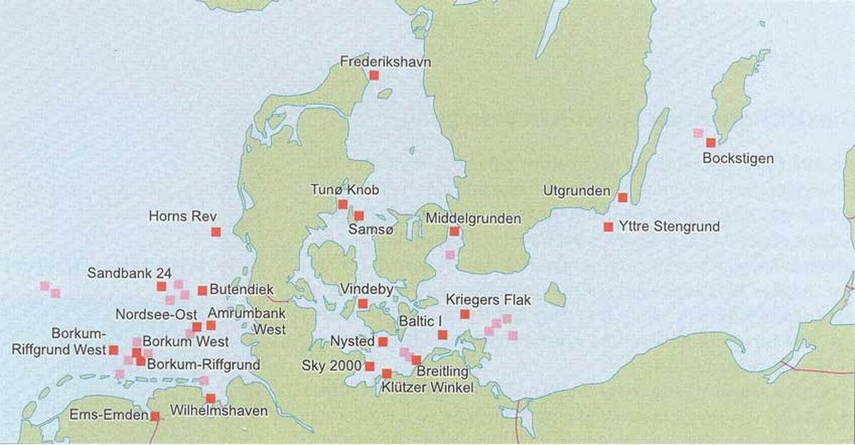 Na mapce Morskie farmy wiatrowe wokól Danii
