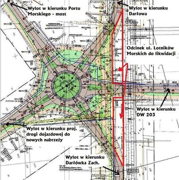 Pięciowylotowe rondo będzie usytuowane po wschodniej stronie ul. Lotników Morskich. Od strony zachodniej ronda będą trzy wyloty, dwa w kierunku ul Lotników Morskich (do Darłówka zachodniego i do Darłowa), a pomiędzy nimi wylot na budowaną nową drogę do portu, biegnąca w kierunku drogi krajowej 37. Po stronie wschodniej jeden wylot będzie miał połączenie z drogą wiodąca przez nowy most i drugi w kierunku przyszłej drogi, jaka ma biec równolegle do Wieprzy za elewatorami i ciągnąć się aż do rzeki Grabowej. Rondo będzie mieć średnicę zewnętrzną 45 metrów i wewnętrzną 28 m. Natomiast dwukierunkowa droga o nawierzchni bitumicznej i szerokości 7 m biegła będzie po nasypie. W odległości 3 m równolegle o drogi przebiegać będzie ścieżka pieszo-rowerowa o szerokości 3,5 metra. Budowę prowadzi firma Skanska, która wygrała przetarg nieograniczony na w/w inwestycję.