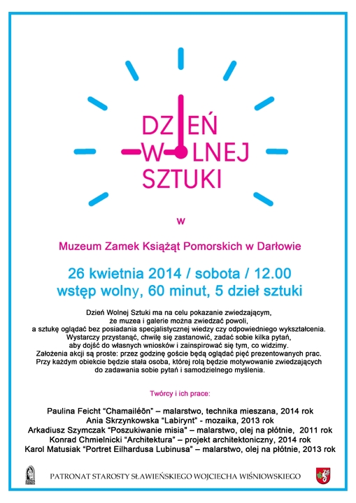 26 kwietnia 2014 roku zamek w Darłowie weźmie po raz drugi udział w ogólnopolskiej edycji Dnia Wolnej Sztuki. Tym razem zostanie zaprezentowanych pięć prac młodych twórców związanych z Darłowem. Ideą Dnia Wolnej Sztuki jest pokazanie zwiedzającym, że muzea oraz galerie można zwiedzać powoli, a sztukę oglądać bez posiadania specjalistycznej wiedzy czy odpowiedniego wykształcenia. Wystarczy przystanąć, chwilę się zastanowić, zadać sobie kilka pytań, aby dojść do własnych wniosków i zainspirować się tym, co widzimy. Prace prezentowane będą o godzinie 12.00. O dziełach opowiedzą i zmotywują do zadawania sobie pytań i samodzielnego myślenia wolontariusze oraz sami twórcy.