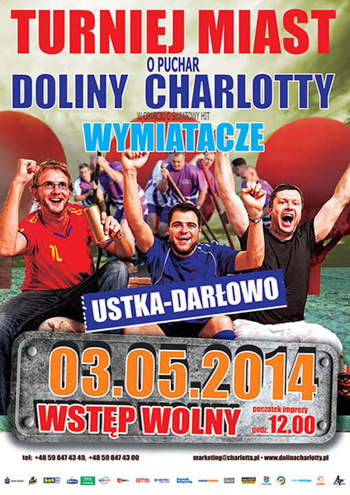 Już za kilka, w trakcie wielkiej majówki 3 maja 2014 o Puchar Doliny Charlotty rywalizować będą ze sobą nadbałtyckie kurorty – Miasto Darłowo oraz Ustka. W sportowym pojedynku miast nie zabraknie atrakcji. Niezwykle widowiskowo zapowiadają się konkurencje przygotowywane dla zawodników. Tu nie tylko sportowa kondycja będzie miała wpływ na wynik ale również spryt i wyrachowanie zawodników. Przypomnijmy – program zawodów został oparty na formule światowego hitu „WIPEOUT - Wymiatacze”. W turnieju udział weźmie sześć drużyn czteroosobowych po trzy z każdego z miast. Wszystkich zainteresowanych tym wydarzeniem mieszkańców Darłowa zapraszamy do naszej, darłowskiej strefy kibica. Tych, którzy chcieliby skorzystać ze zorganizowanej formy transportu zapraszamy na pokład Regionalbusa Expressu (tel. 519 30 30 32).
