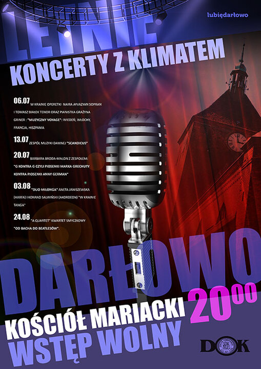 Darłowo - kurort z klimatem. Tego lata, w Darłowie poza organizacją festiwalu organowego - najstarszego z miejskich festiwali (Kościół Św. Gertrudy) odbędą się muzyczne koncerty z klimatem w gotyckim Kościele Mariackim. W ramach muzycznego cyklu usłyszymy m.in. dobrze znane piosenki Anny German i Marka Grechuty czy kwartet smyczkowy w koncercie „Od Bacha do Beatlesów". Koncerty te organizowane będą zawsze w niedzielę o godzinie 20:00 w Darłowie (Kościół Mariacki) a wstęp na nie będzie bezpłatny. Już dziś zapraszamy do Darłowa pełnego muzyki: 06.07 W krainie operetki Naira Ayvazyan sopran i Tomasz Białek tenor oraz pianistka Grażyna Griner : "Muzyczny voyage": Wiedeń, Włochy, Francja, Hiszpania 13.07 Zespół Muzyki Dawnej "Scandicus" 20.07 Barbara Broda-Malon z zespołem: "G kontra G czyli piosenki Marka Grechuty kontra piosenki Anny German" 03.08 "Duo Milonga" Aneta Janiszewska (harfa) i Konrad Salwiński (akordeon) "W krainie tanga" 24.08 "A Quartet" kwartet smyczkowy "Od Bacha do Beatlesów". Organizatorem powyższych wydarzeń będzie Darłowski Ośrodek Kultury im. Leopolda Tyrmanda.